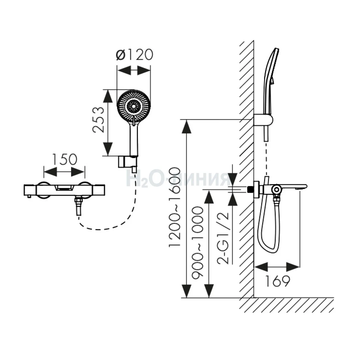 Размер ручной лейки, мм Ø120х253