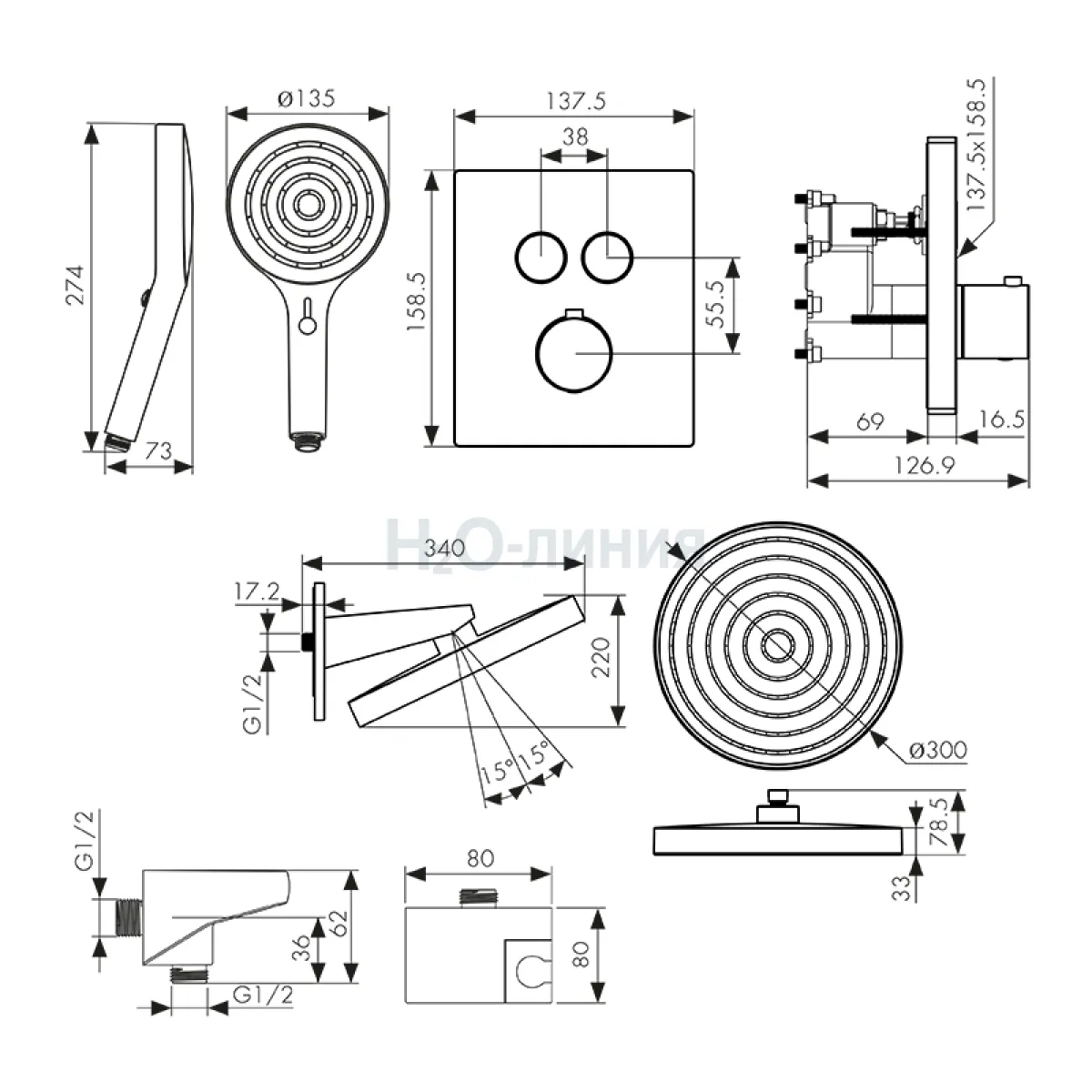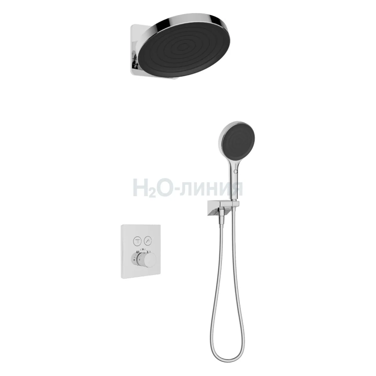 смеситель скрытого монтажа, скрытая монтажная часть, кронштейн, лейки, настенное соединение шланга с поворотным держателем, шланг, крепления