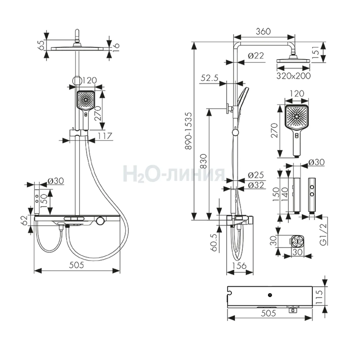 смеситель, релинг, верхний душ, душ. лейка, держатель лейки, шланг, гиг.лейка, шланг, крепления