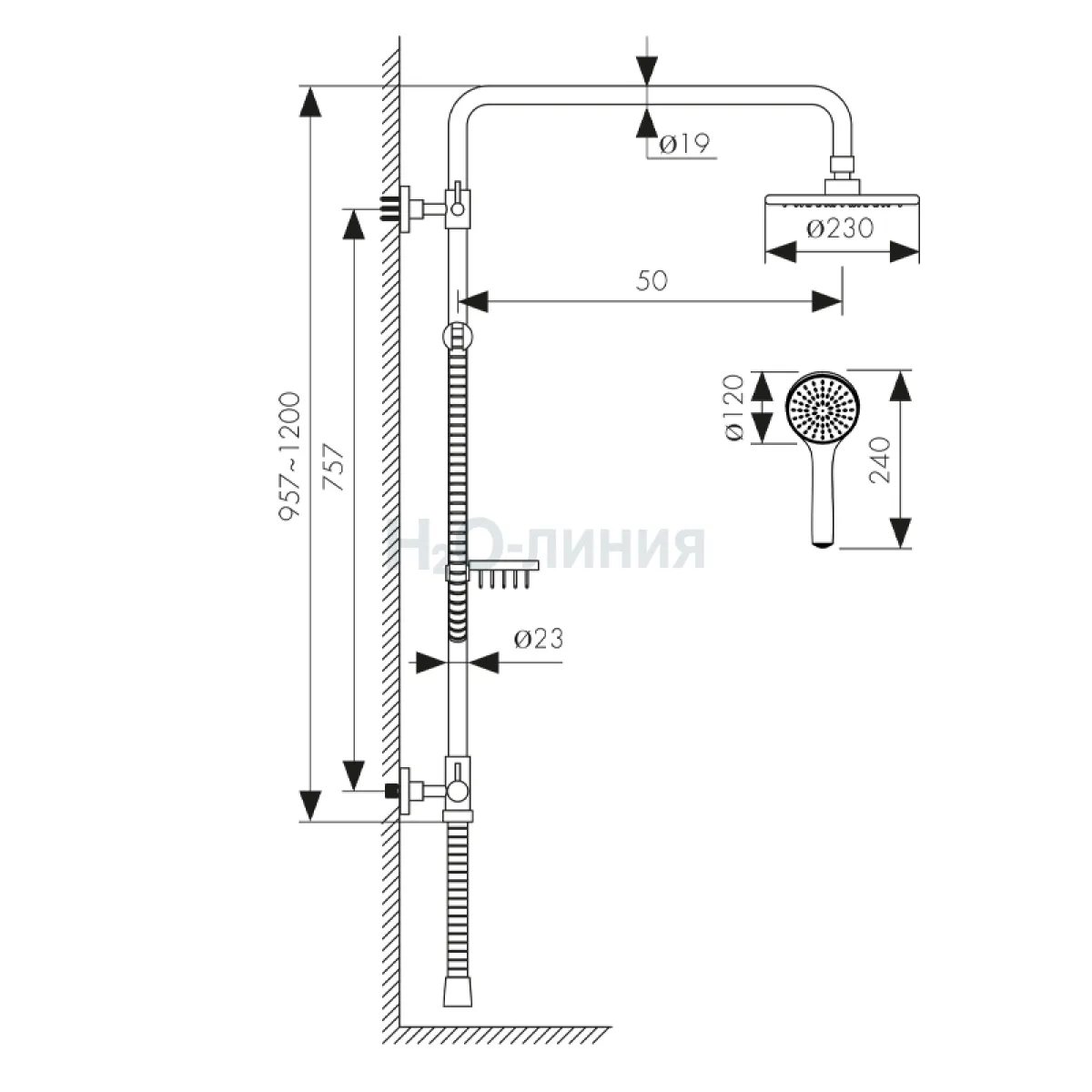 смеситель, релинг, верхний душ, душевая лейка, держатель лейки, шланг, крепления