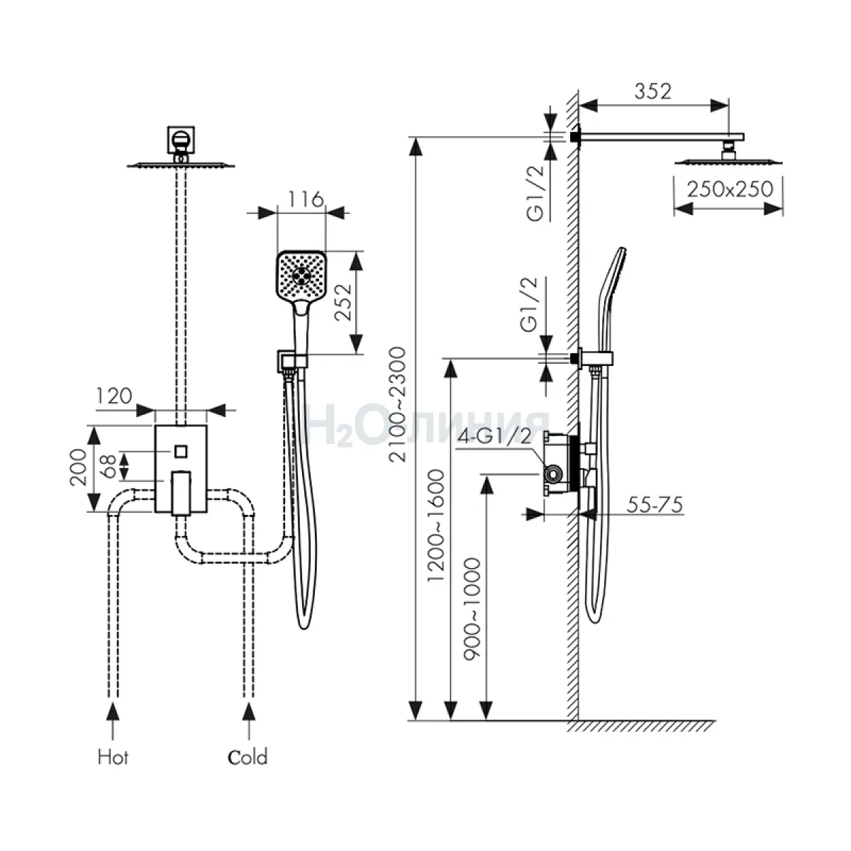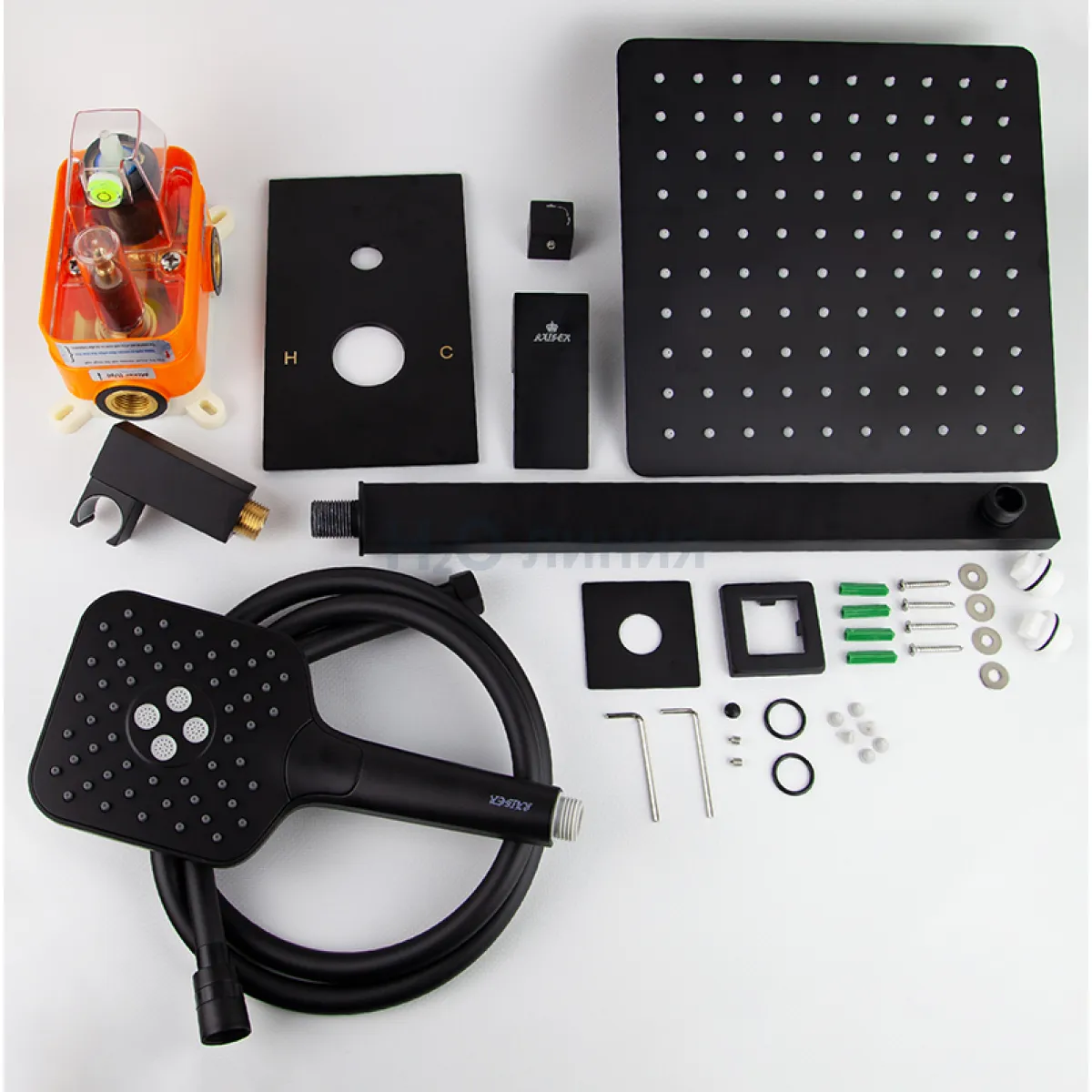 смеситель, релинг, верхний душ, душевая лейка, держатель лейки, шланг, крепления