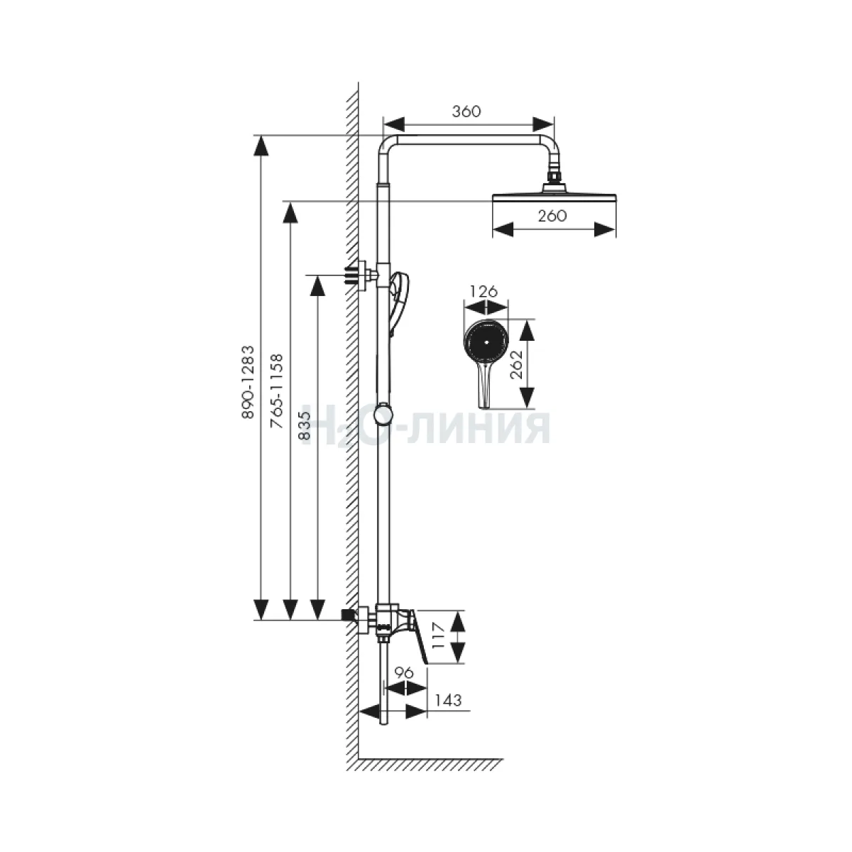 смеситель, релинг, верхний душ, душевая лейка, держатель лейки, шланг, крепления