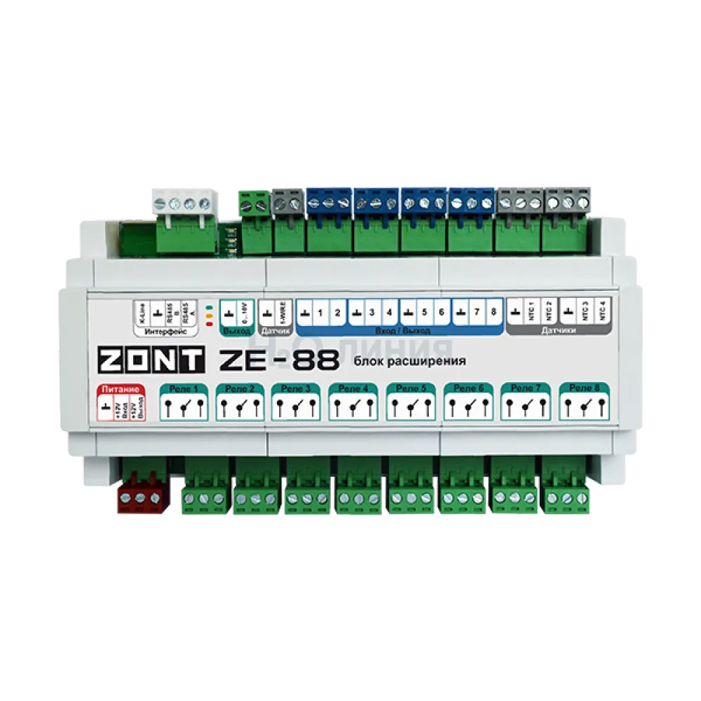 Блок расширения ZE-88 может подключаться к контроллеру ZONT через интерфейс K-Line. При таком виде связи максимальное удаление блока от контроллера составляет 10-15 м.