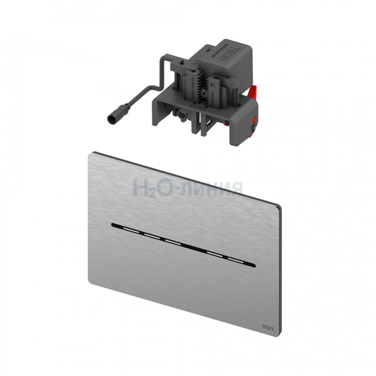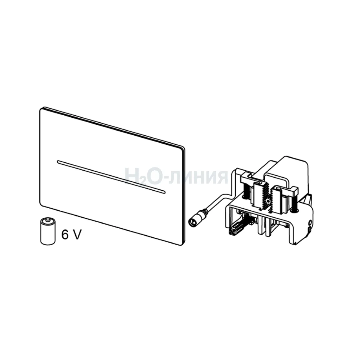 Плоская панель из нержавеющей стали в комплекте с крепежными элементами, герметичным отсеком для батарей для установки внутри бачка (4 батареи тип Mono/D/LR 20) и электроприводом смыва для систем двойного смыва. Совместима с контейнером для гигиенических таблеток.