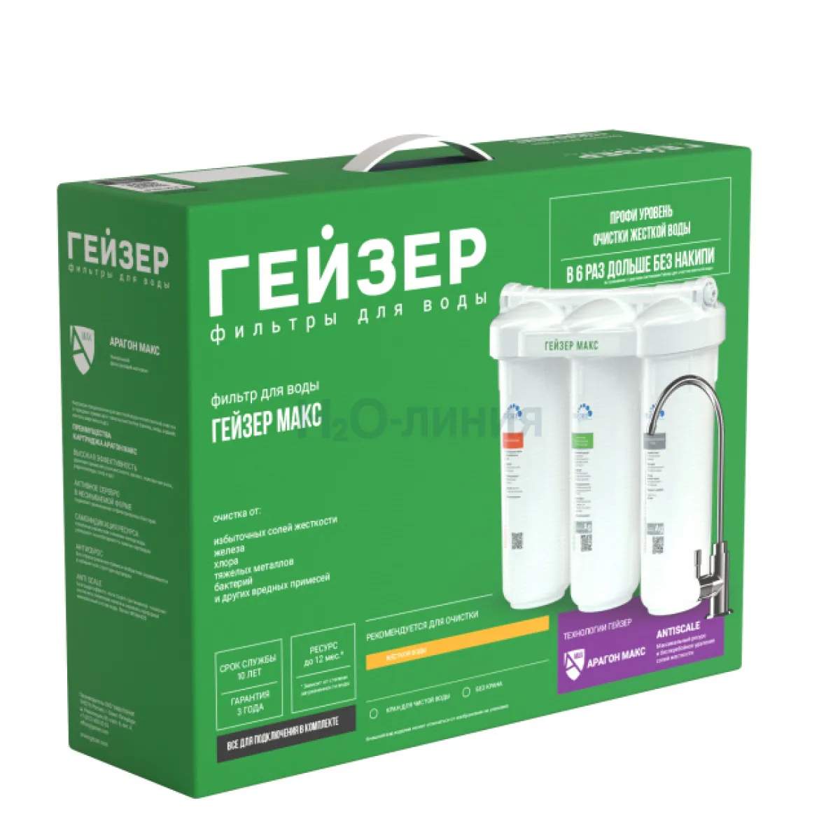 Фильтр Гейзер МАКС предназначен для эффективного умягчения, снижения накипи и очистки жесткой воды. Благодаря использованию новейших инновационных фильтрующих материалов - картриджа Арагон Макс и специальной комбинации ионообменных смол АкваСофт — способность фильтра Гейзер МАКС устранять накипь в 6 раз выше, чем у традиционных систем для умягчения воды! При этом фильтр не нуждается в периодическом обслуживании (регенерации).