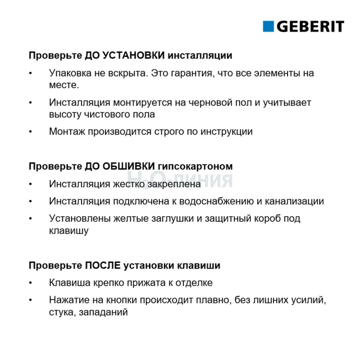 Проверьте ДО УСТАНОВКИ инсталляции Упаковка не вскрыта. Это гарантия, что все элементы на месте. Монтаж осуществляется строго по инструкции Инсталляция монтируется на черновой пол и учитывает высоту чистового пола