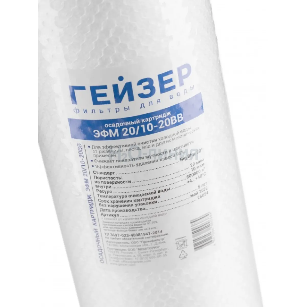 Градиентный картридж Гейзер ЭФМ 20/10 20BB – это фильтрующий модуль с увеличенным ресурсом. Он изготовлен из пористого полипропилена и предназначен для очистки холодной питьевой и технической воды от примесей крупнее 10 мкм: песка, частиц ржавчины и подобных загрязнений.