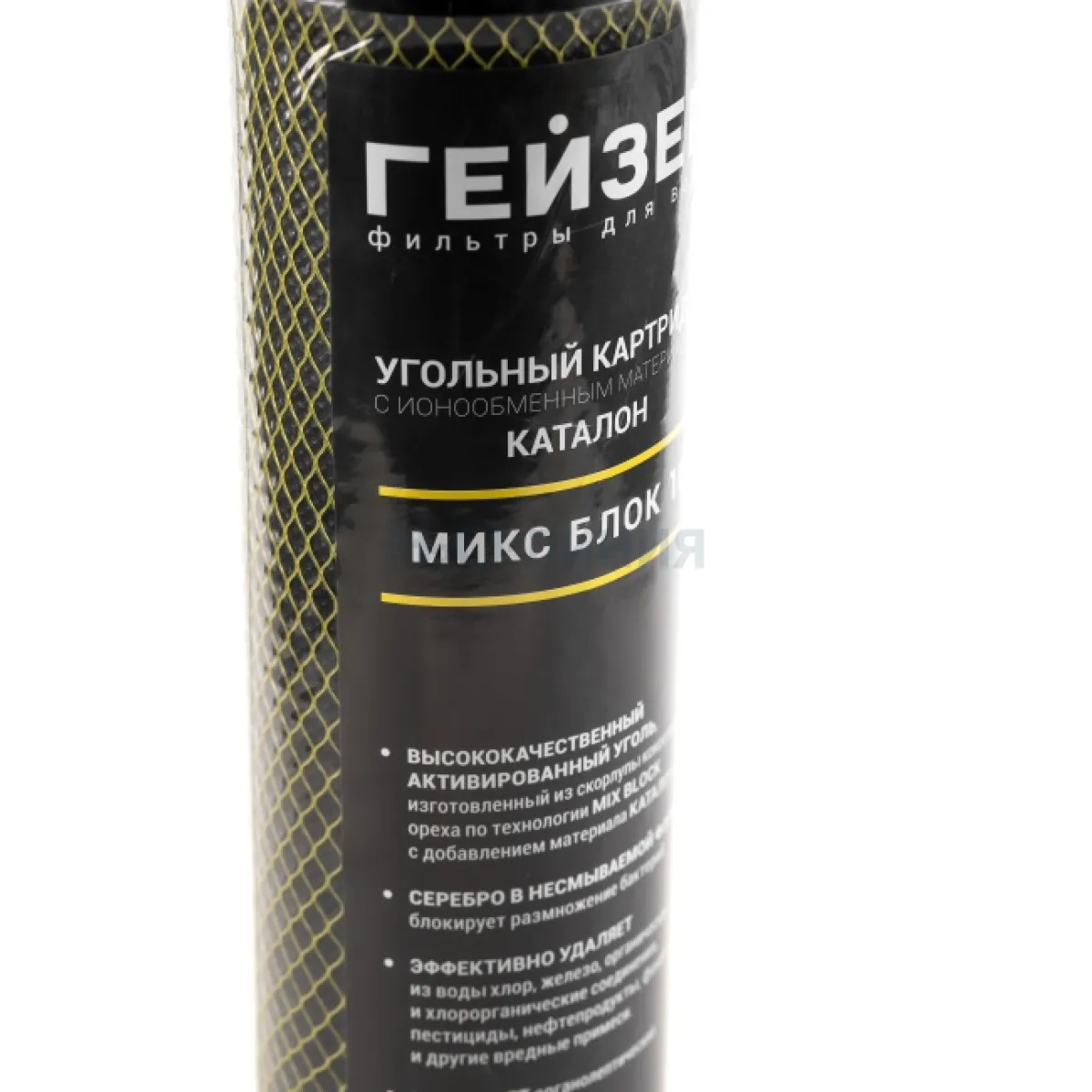Картридж Гейзер Микс Блок (пористость – 10 мкм) применяется для финишной доочистки водопроводной воды в стационарных фильтрах стандарта Slim Line 10”. Эффективно удаляет из воды хлор, железо, органические и хлорорганические соединения, пестициды, нефтепродукты, фенолы и другие вредные примеси. Улучшает органолептические показатели воды – цвет, запах и вкус воды.
