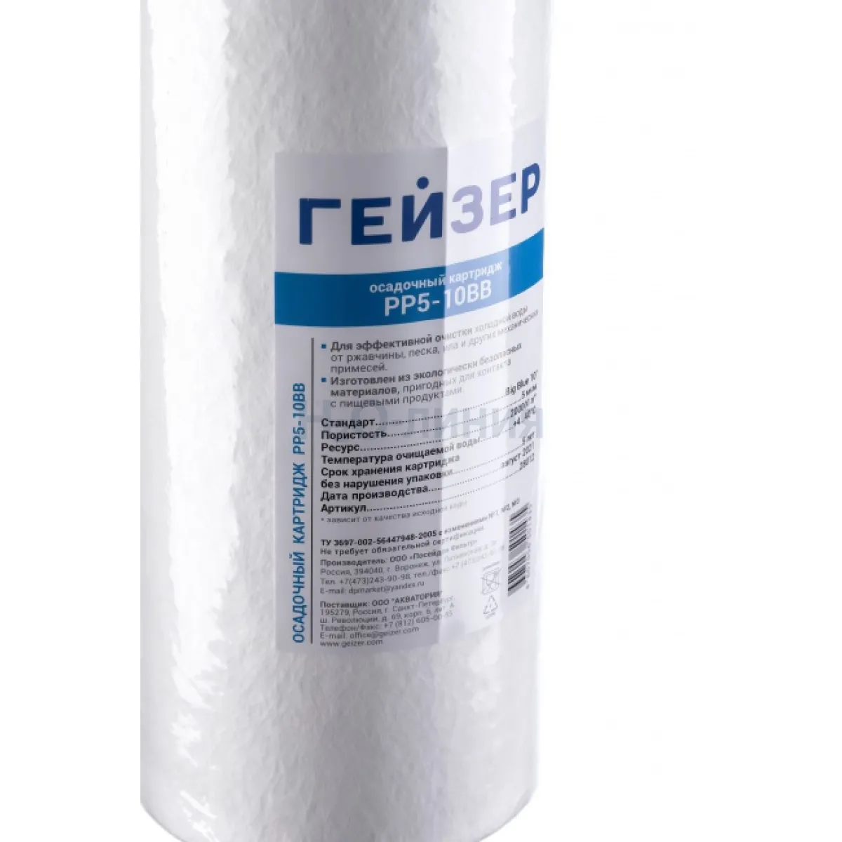Картридж PP 5 – 10ВВ применяется в магистральном фильтре Гейзер Джамбо 10 для очистки воды от нерастворимых примесей (более 5 мкм). Производство: Россия.
