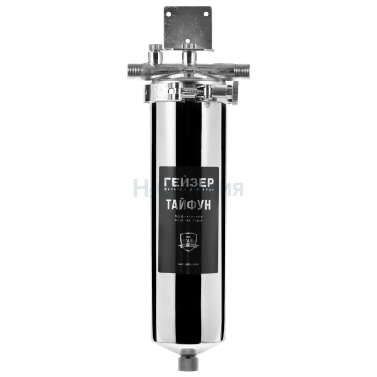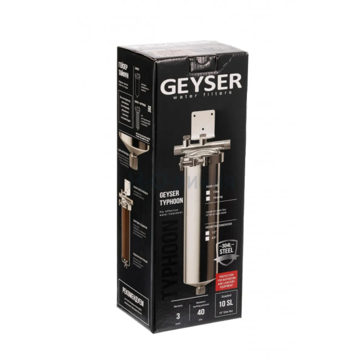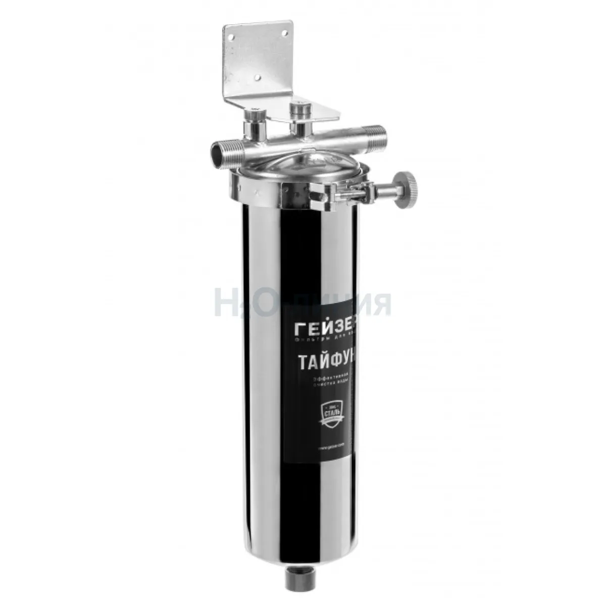 Корпус и крышка фильтра Гейзер Тайфун 10SL 1/2" изготовлены из высококачественной нержавеющей стали марки 304L с металлической скобой. Корпус рассчитан на работу под давлением и установку на входе в систему горячего или холодного водоснабжения. Внизу корпуса находится клапан слива воды для удобной замены картриджа.