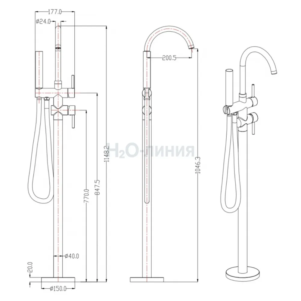 Смеситель, ручная лейка, стойка, монтажный комплект
